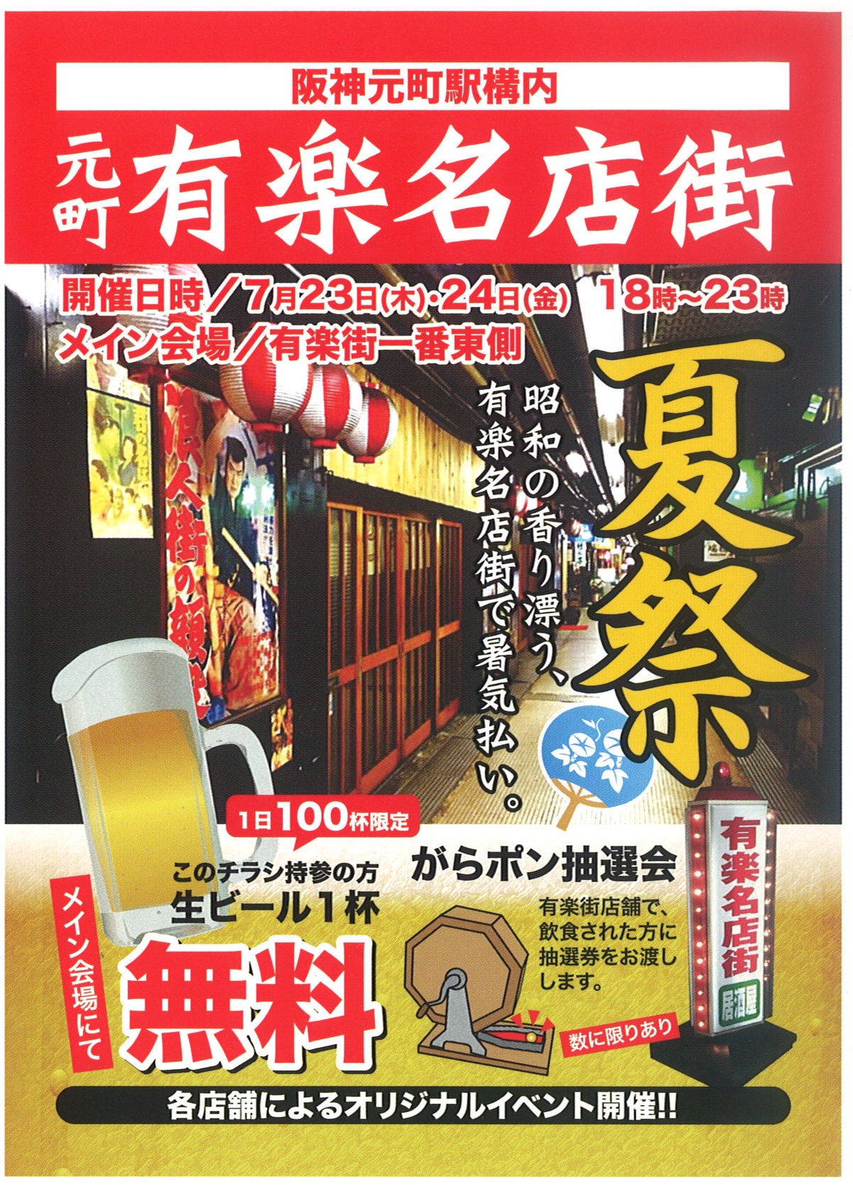 元町有楽名店街では23・24日の18時から、「夏祭」が開催されます。