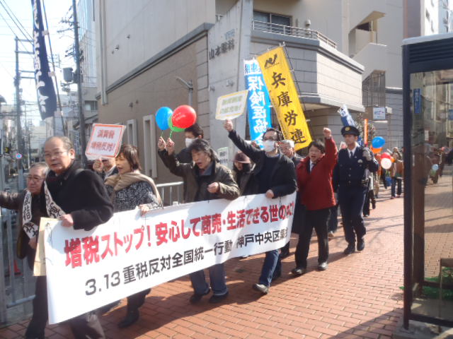 集会後、会場の兵庫県民会館から神戸税務署までシュプレヒコールをしながら、プラカードや風船を持ってデモ行進をしました。